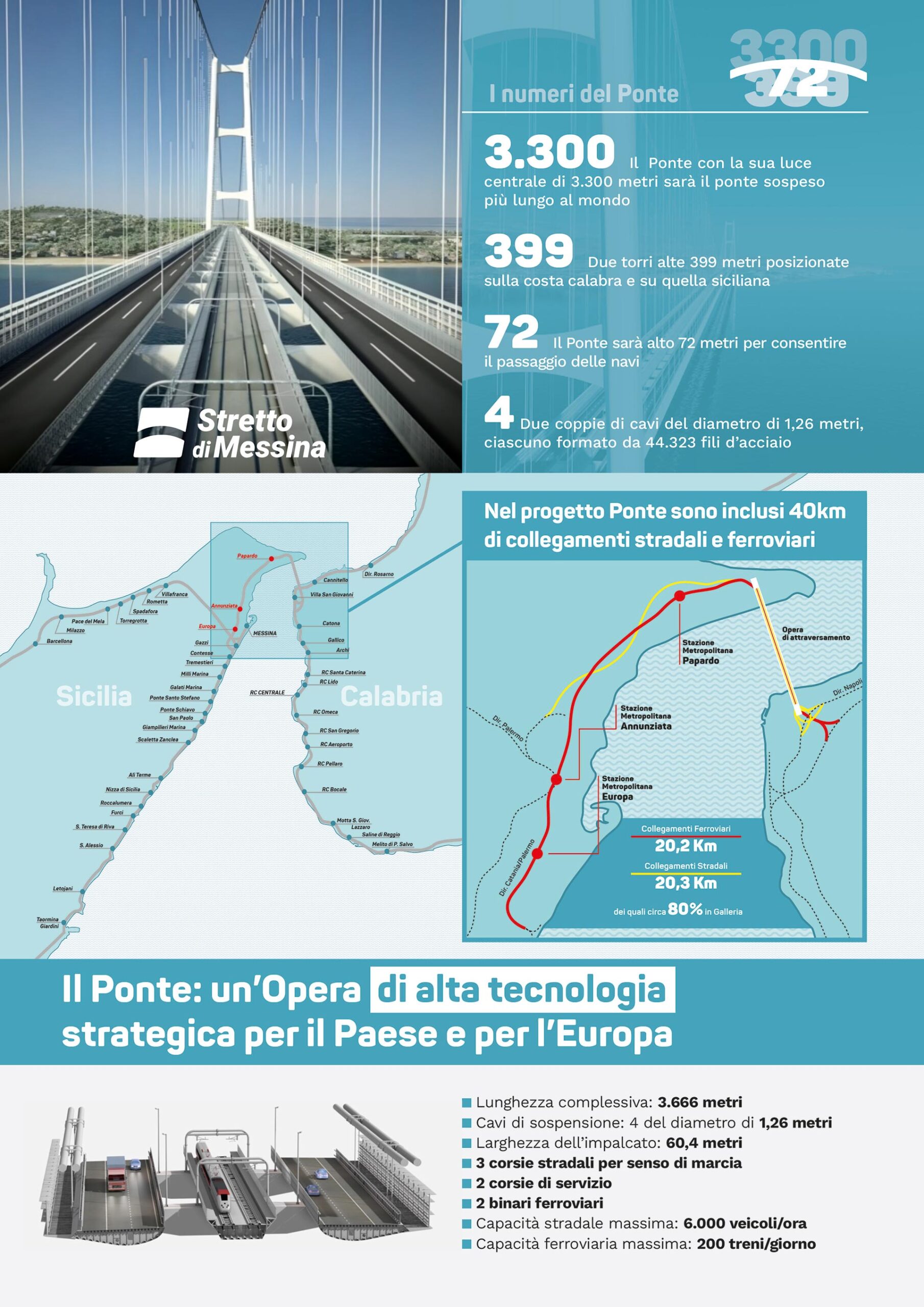 Press Kit I numeri del Ponte I collegamenti Le caratteristiche tecniche Press Materials August 6, 2025 The design of the Messina Strait Bridge (PDF 1 mb) I numeri del ponte (IMG 340 kb) I collegamenti (IMG 365 kb) Le caratteristiche tecniche (IMG 290 kb) Scheda di sintesi (IMG 639 kb) Press release after CIPESS approval 06.08.2025 (PDF 96 kb) Dichiarazione AD post CIPESS 06.08.2025 (Video)