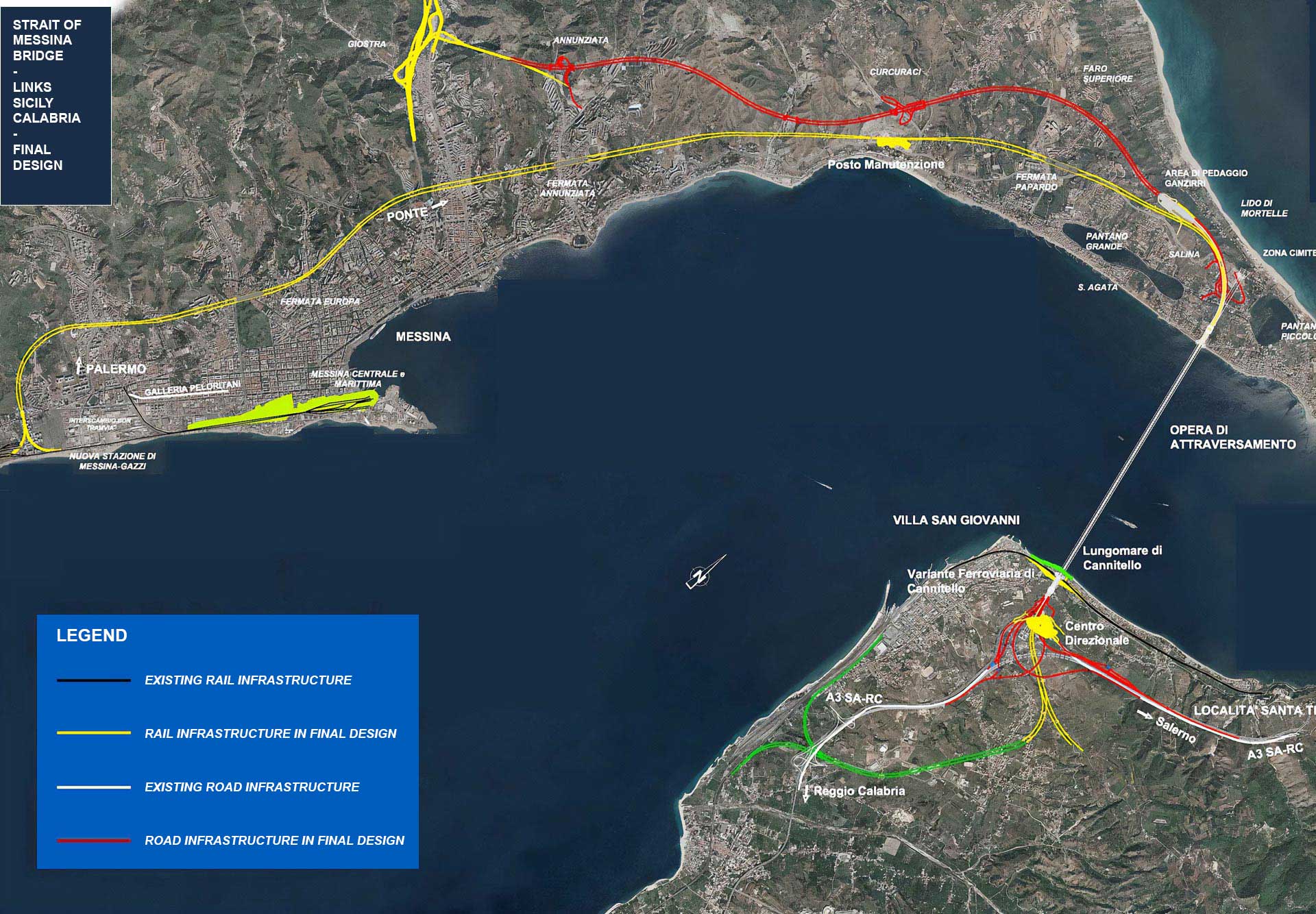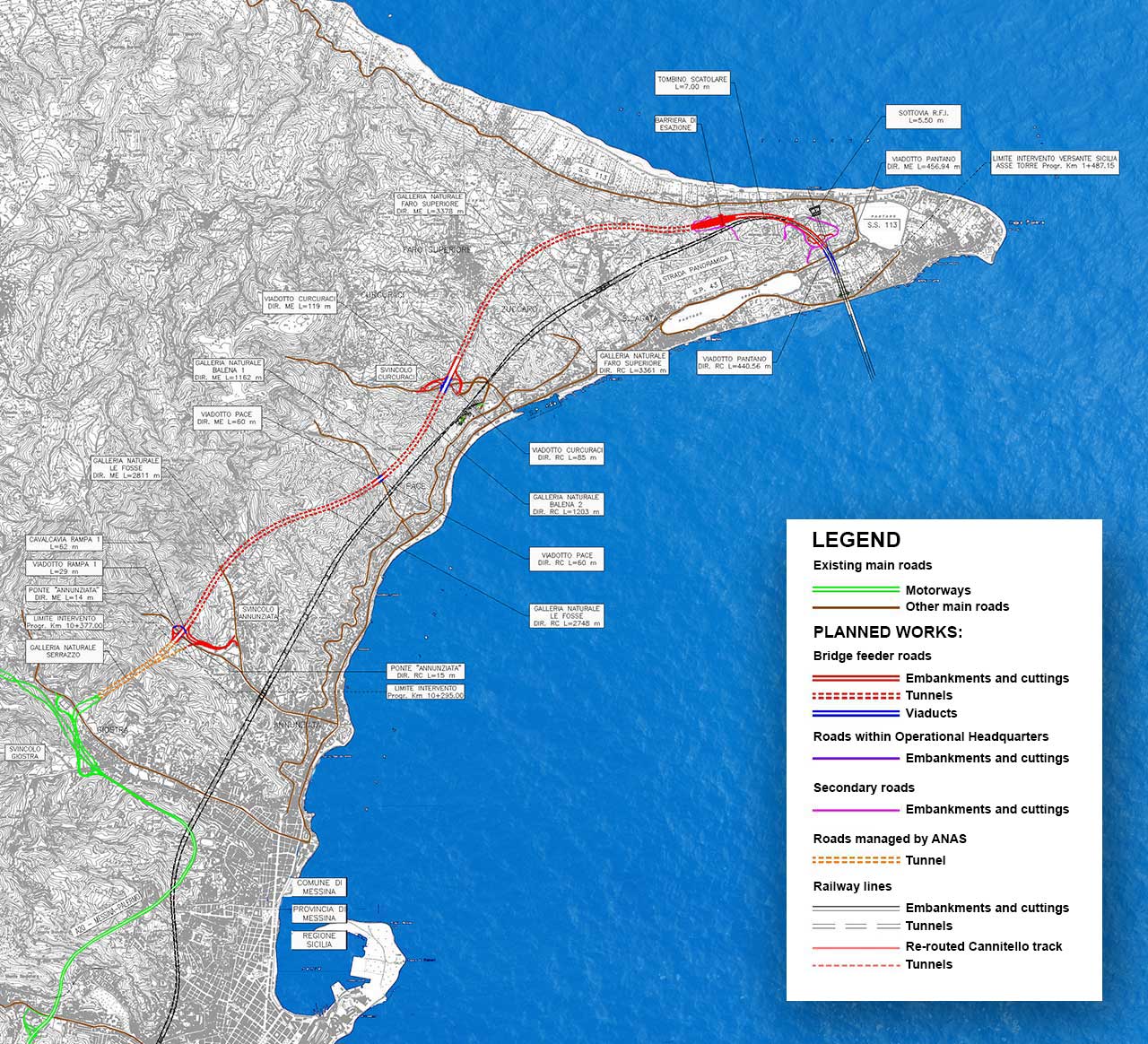 The road and rail infrastructure linking the Bridge to the surrounding areas include 40 km of road and rail links (approximately 80% of which running through tunnels) connecting, on the Calabrian side, with the Autostrada del Mediterraneo and Villa San Giovanni train station and, on the Sicilian side, with the Messina-Catania and Messina-Palermo motorways and the new Messina train station.